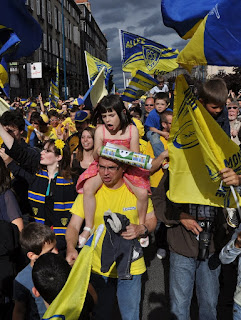 Rugby ce n'est pas mon jeu préféré, mais 29 Mai 2010 c'est un jour historique pour Clermont Ferrand! Premiere fois apres 10 fois dans la finale l'equipe de rugby de Clermont-Ferrand a gagne! Et moi, par hasard, j'etais au Clermont! Ambience etait magnifique! bcp bcp de monde avec de grands sourires! Bravo!!! Les jaune et blue!